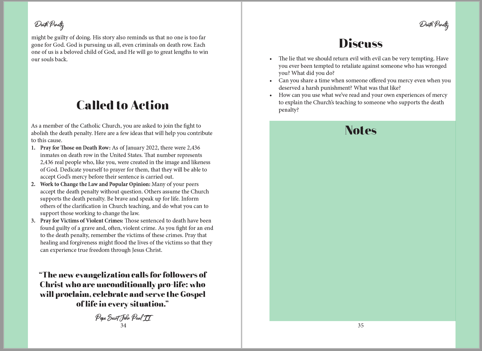 Called to Action: In the final section we ask you to get to work. Whether it be a challenge to learn more, take up an important prayer intention or become and advocate, once we know the truth we need to be part of sharing it with others.