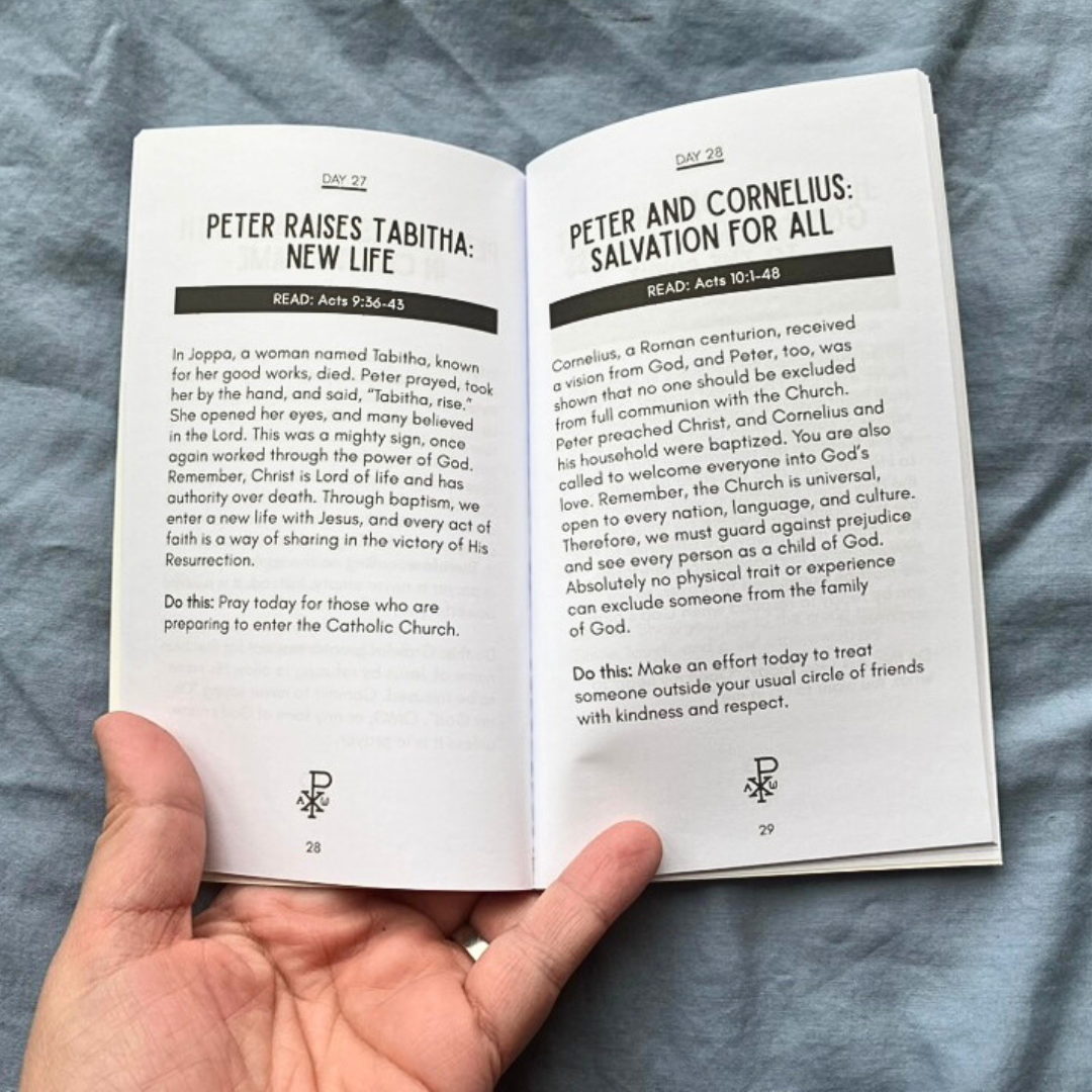 Each day, just grab a Bible and read the Bible verses (found either in Luke’s Gospel or the Acts of the Apostles). Then return to the devotional, read the short reflection, and complete the simple “Do this” challenge. Finally, record any thoughts or revelations from prayer. That’s it!