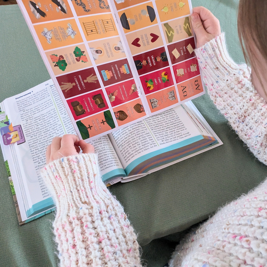 There are many Bible Tabs…but this set was designed for kids! The image on each Bible Tab is colorful and intended to help kids get to know the books of the Bible. Also, the Bible tabs are easy to remove and add to a Bible.