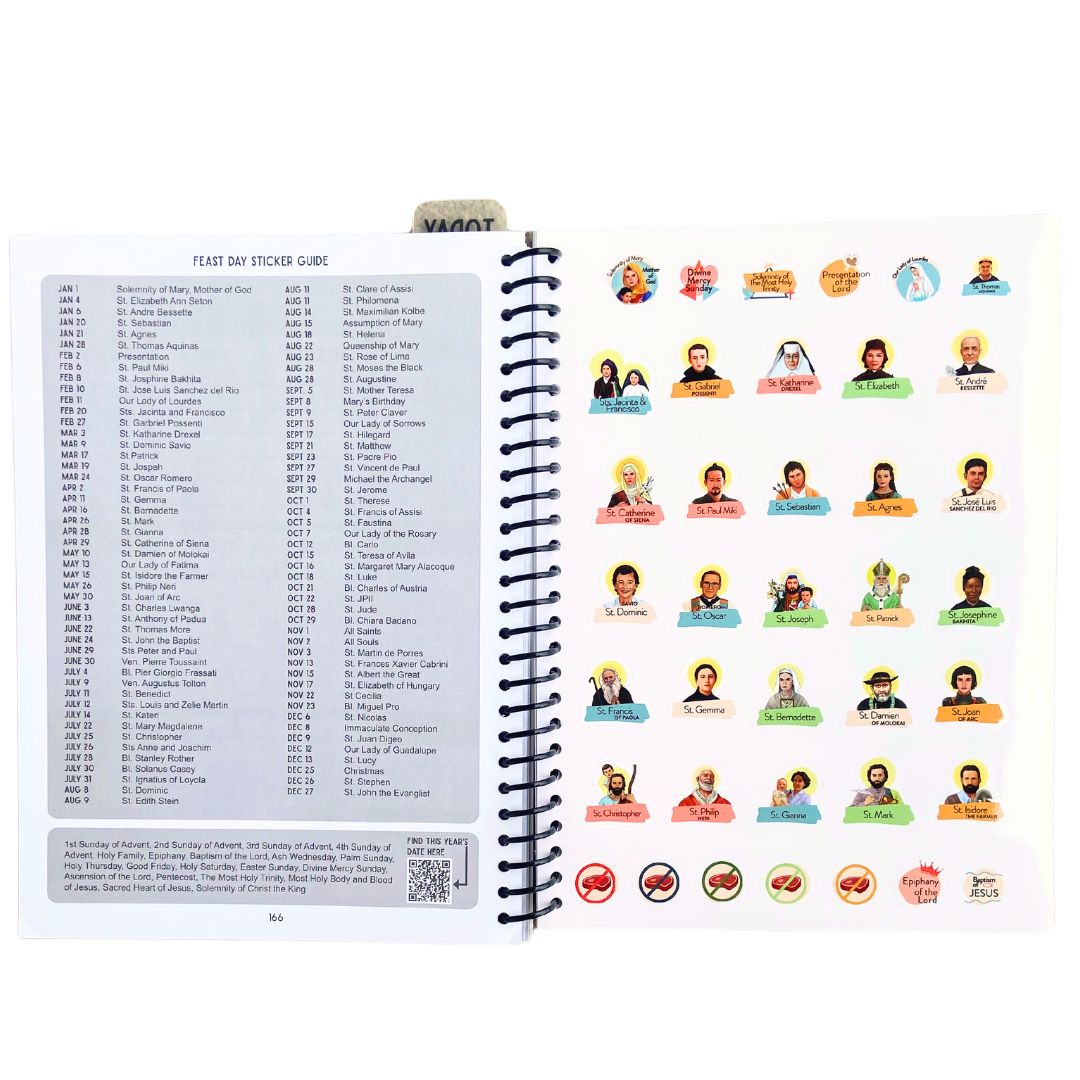 That’s right! We have included ALL of our saint and liturgical stickers in the back of this planner! Although the planner is undated, we have included dates corresponding to the stickers on the final pages of the planner. So, each month, you can have fun adding stickers to the appropriate days!