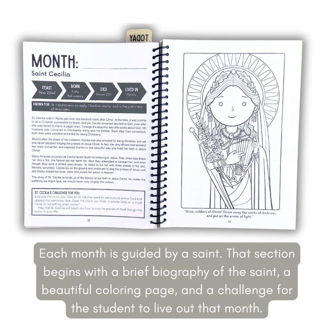 Each month is guided by a saint. That section begins with a brief biography of the saint, a beautiful coloring page, and a challenge for the student to live out that month. The 12 saints included in this planner are: